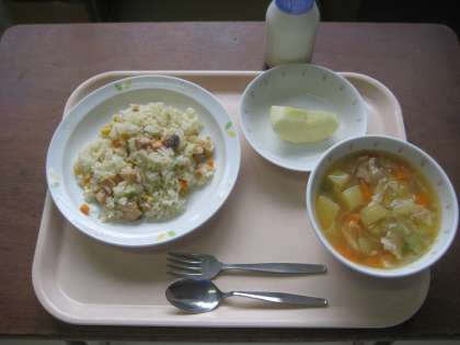 鮭ピラフ 白いんげん豆の田舎風スープ りんご 牛乳