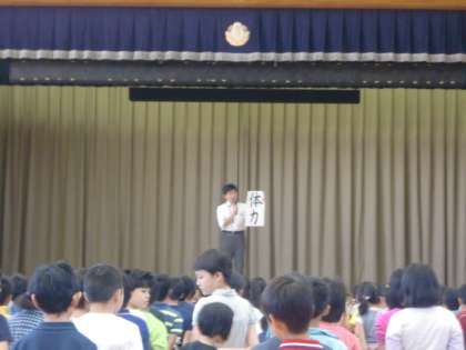 今朝は校庭で低学年体育朝会、体育館で高学年朝会がありました。