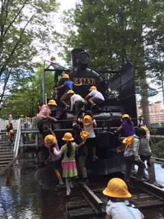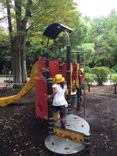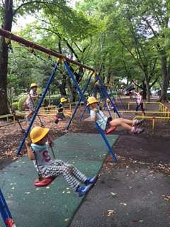 記念撮影のあと、汽車の上まで登ったり、ブランコに乗ったりして遊びました。このあと砧公園に向けて歩きます!