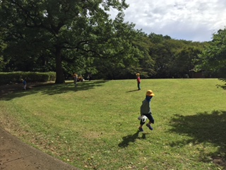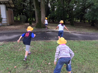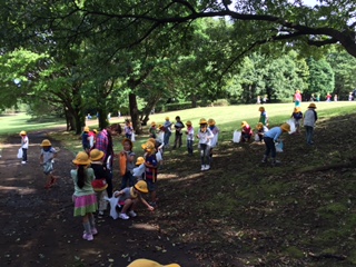 お弁当タイムが終わり、デザートやおやつもたくさん食べました。ドングリを拾って、これから芝生広場で遊びます!