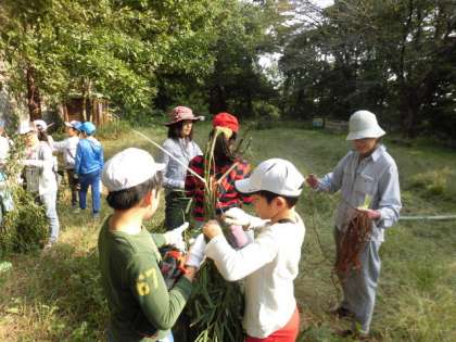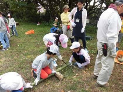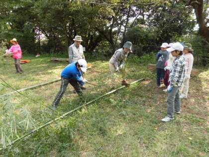 竹の枝を落とし、まとめ、竹を切る体験をしました。