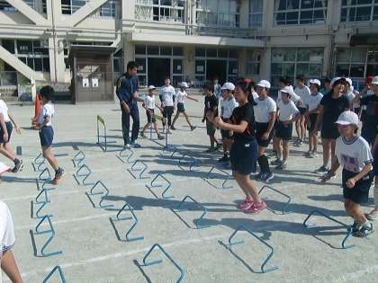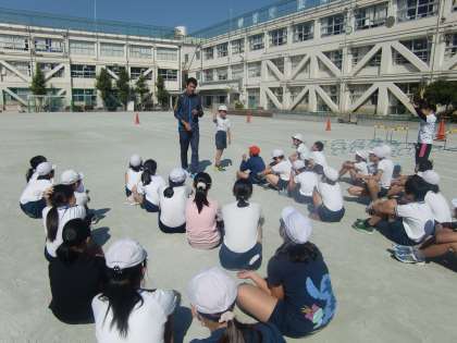 明正小学校はオリンピック・パラリンピック推進校であるため、ミズノトラッククラブ所属の飯塚翔太選手に来校していただき、6年生に速く走るコツを教えていただきました。