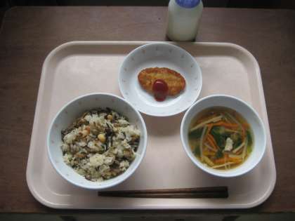 豆入りひじきごはん 豆腐のナゲット 沢煮椀 牛乳