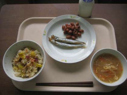 秋の香りごはん 焼きししゃも 煮豆 大根のみそ汁 牛乳