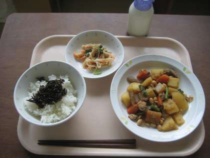 ごはん ひじきのふりかけ 豆入り筑前煮 野菜のごまみそかけ 牛乳