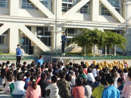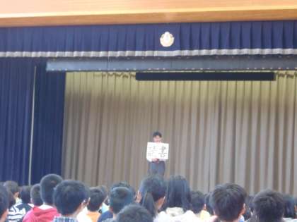 今朝は体育館で高学年朝会、校庭で低学年体育朝会がありました。