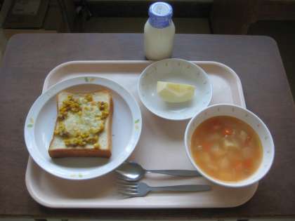 ハムコーントースト タラのトマトスープ りんご 牛乳
