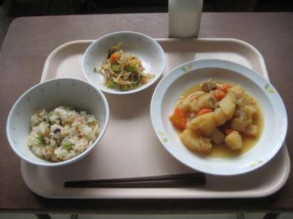 まめまめおこわ 肉じゃがうま煮 野菜のごまあえ 牛乳