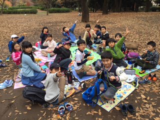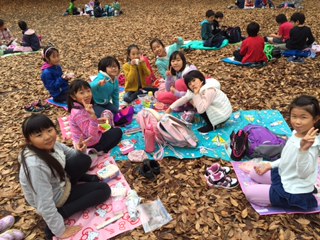ほぼ全員が、美味しいお弁当を食べ終わりました。あっという間に、落ち葉のじゅうたんの上での鬼ごっこが始まりました!