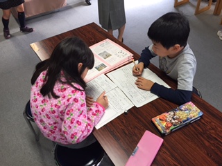 二人または三人組で、DVDや資料から分かったことをまとめています。学習態度が良いと褒めていただきました!