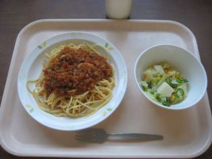 スパゲッティミートソース ポテト入りフレンチサラダ 牛乳