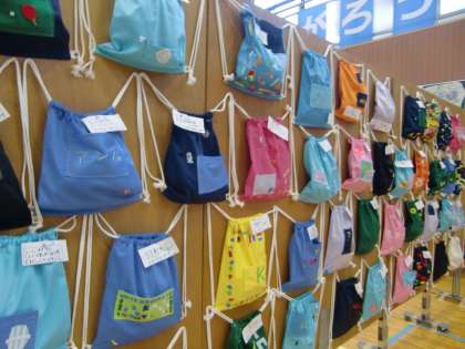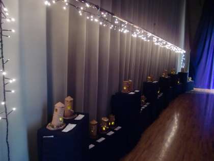 写真はアルミオブジェと灯台ミステリー、カラフルナップザックです。灯台ミステリーは舞台裏に幻想的に展示されています