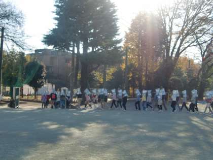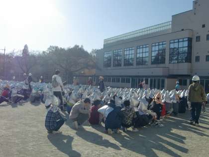 今日は12月の避難訓練がありました。学校の近隣で火災が起きた想定で行い、第二次避難所である里山まで避難しました。