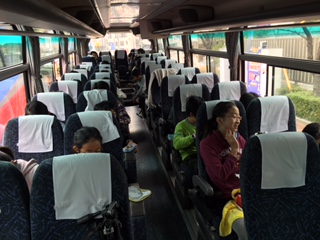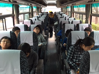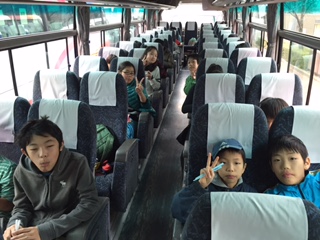 今日は風が強くて寒いので、外ではなくバスの中でお弁当を食べています。食事の時だけは、静かです!