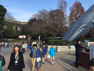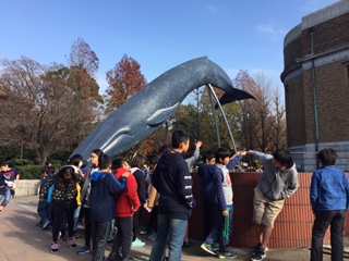 バスの中から東京スカイツリーを見ながら、今、上野の国立科学博物館に到着しました。大きなクジラに迎えられ、これから館内に入ります!