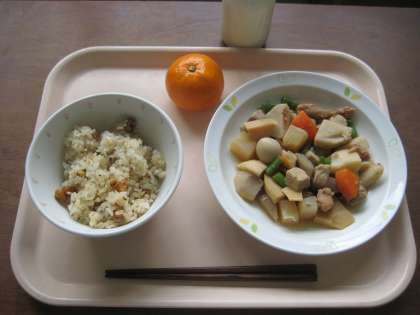 豆ごはん 鶏肉と里芋のうま煮 みかん 牛乳