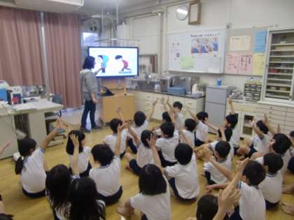 今日は保健室で1年生の発育測定がありました。測定の前に養護の先生から防寒の仕方について話がありました。