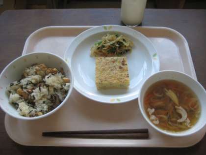 豆入りひじきごはん 切干大根の卵焼き 野菜のごまあえ 沢煮椀 牛乳