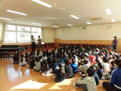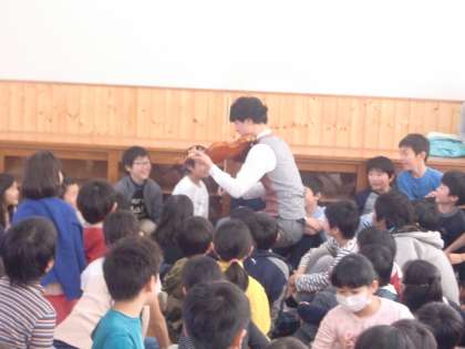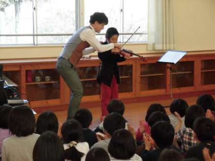 今日は音楽の授業でバイオリンコンサートがありました。バイオリンを触らせてもらったり、手拍子や足でリズムをとったり、楽しい時間を過ごすことができました。