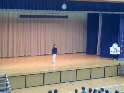 今朝は体育館で児童集会(スーパーキッズ)がありました。