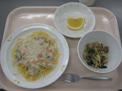 スパゲッティクリームソース ほうれん草のサラダ はるか 牛乳