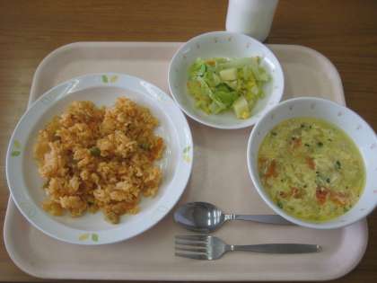 チキンライス ポテト入りフレンチサラダ 卵スープ 牛乳