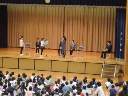 6時間目、昨年度末で明正小を離れられた方々を囲んだ離任式が行われました。代表児童は今日に向けて準備をしてきたメッセージを読み上げました。退場では、全校で「変わらないもの」を歌い、先生方を見送りました。