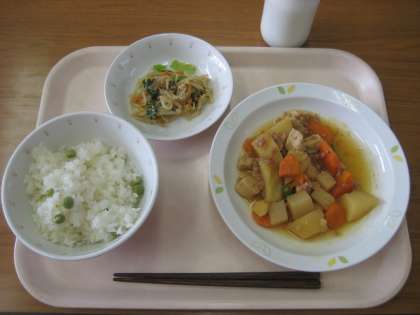 グリンピースごはん 新じゃがのそぼろ煮 野菜のごまだれかけ 牛乳