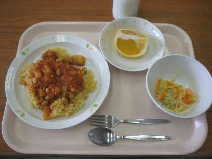 チリビーンズライス たまねぎドレッシングサラダ 美生柑 牛乳