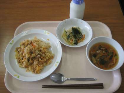 キムチチャーハン かむかむ海草サラダ 春雨スープ 牛乳