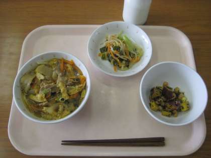カレーうどん お豆かりんとう わかめサラダ 牛乳