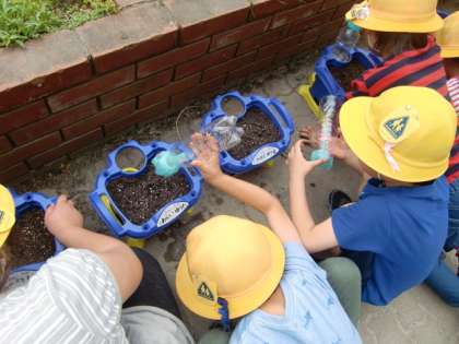 1年生は生活科の授業であさがおを育てます。今日は朝顔の種を植えました。大きく成長するよう願いを込めて水やりをしました。