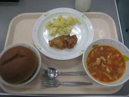あしたばパン 鶏肉の照り焼き パセリポテト 白いんげん豆とトマトのスープ 牛乳