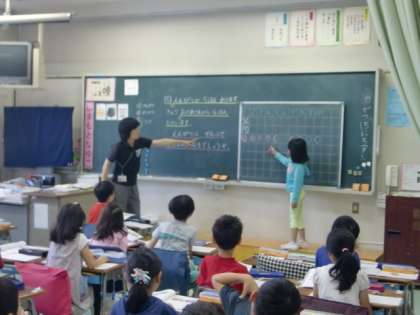 1年生の教室では「たし算」の学習を進めていました。たし算は計算をするだけではなく、言葉で説明することも大切な学習です。発表を通して、たし算を学んでいました。