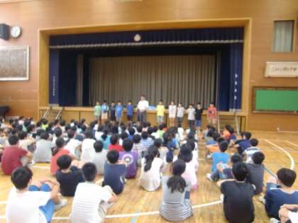 今週から水泳指導期間が始まっています。天候が良くないので、どの学年もまだプールに入ることはできていませんが、体育館でプール開きを行っていました。副校長先生からは「安全」と「目標」について話がありました。