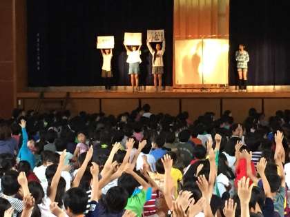今朝は体育館で児童集会があり、「この先生は誰でしょう」クイズが行われました。