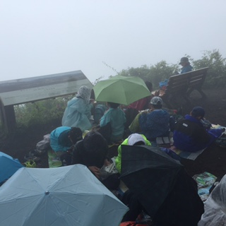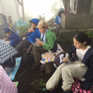 雨の中、見えない景色を想像しながら、傘を差してお弁当を食べました。これから下山しますが、早くお風呂に入りたいです。おやつのアイスクリームは、そのあとですかね!