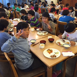 川場での最後の夕食です。雨乞山の頂上でお昼を食べてから、かなり時間が経ったので、みんなよく食べていました。この後は、おもてなしレクです!