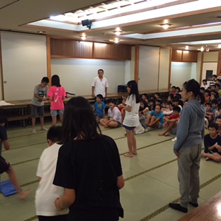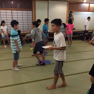 夕食後は、室内レクがありました。クラス対抗でぐるぐるバット、ジャンケン、あっち向いてホイ、なぞなぞを行いました。みんなで大笑いしながら楽しみました!