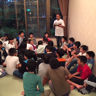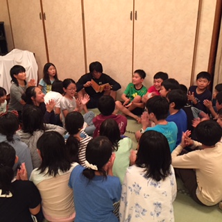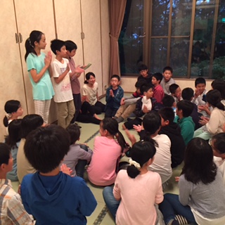 夕食が終わり、これから肝試しが始まります。出発前にペア決めがあり、大盛り上がり。みんな仲良く帰って来られることを願っています!