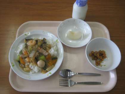 中華丼 大豆とじゃこの甘辛あげ 梨 牛乳