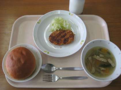丸パン コロッケ キャベツ ベーコンと野菜のスープ 牛乳