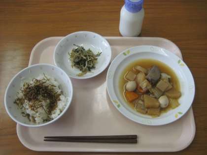 ごはん 小魚のふりかけ ほうれん草の磯あえ 豚肉と大根のうま煮 牛乳