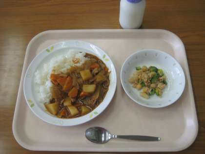 ハッシュドポークライス ビーンズサラダ 牛乳