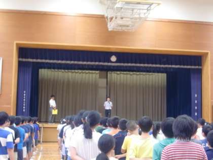 今朝は体育館で高学年朝会がありました。すまいるルームに9月からいらした先生の紹介がありました。低学年体育朝会は校庭の状態が良くなかったため、中止となりました。