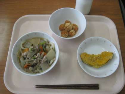 けんちんうどん かぼちゃの天ぷら 月見だんご 牛乳