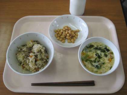 ぶた肉とごぼうのごはん ぶどう豆 かきたま汁 牛乳