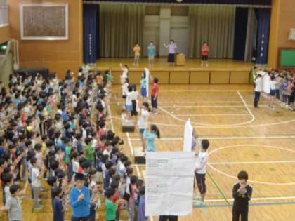 今朝は体育館で音楽朝会がありました。今月の曲は「クラッピング・ファンタジー」です。学年で異なるリズムを手拍子で表現し、全校でリズムの重なりを楽しむことができました。