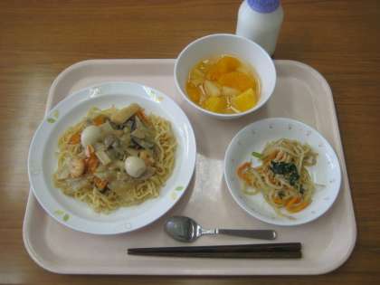 五目あんかけそば ナムル フルーツポンチ 牛乳
