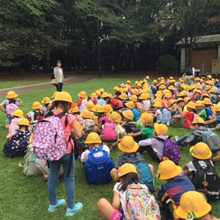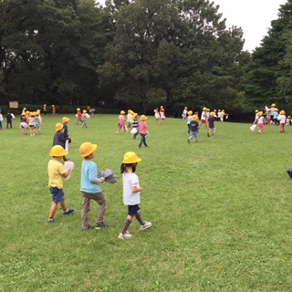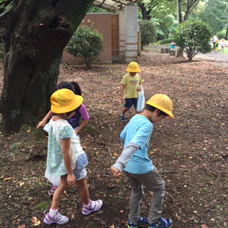 おやつタイムが終わり、ドングリを拾いました。ドングリだけではなく、ゴミも拾いました。これから学校まで帰ります!